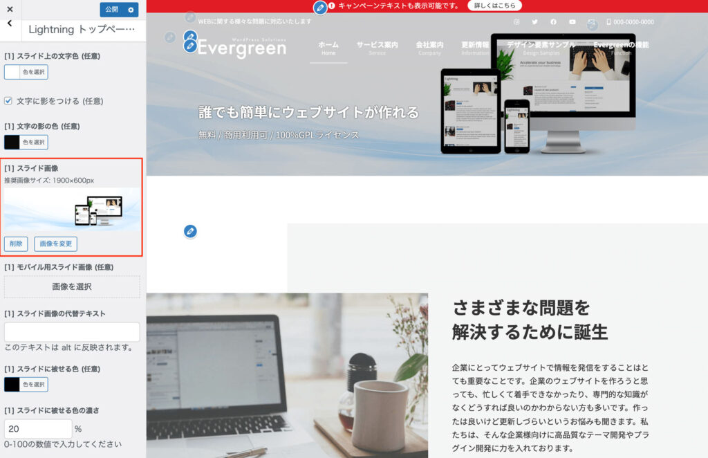 Evergreenのデモサイトでは、「Lightning トップページスライドショー」を非表示に設定しています。トップページに複数の画像を切り替えて表示するスライドショーを利用したい場合は、以下の手順をご参考ください。